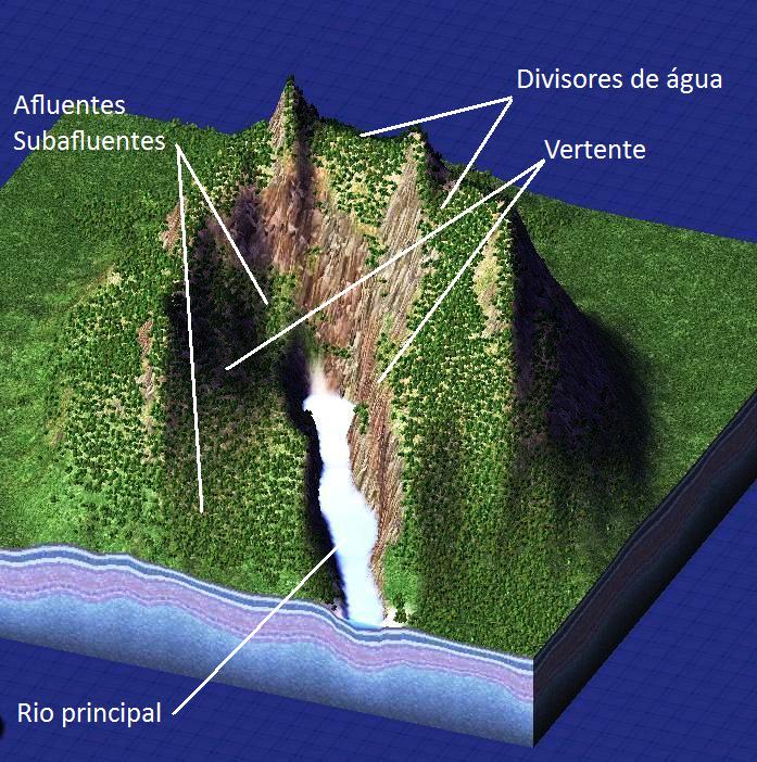 Toda bacia hidrográfica é formada pelas vertentes, pelo rio principal, pelos afluentes e subafluentes, cujo conjunto forma a rede de drenagem.